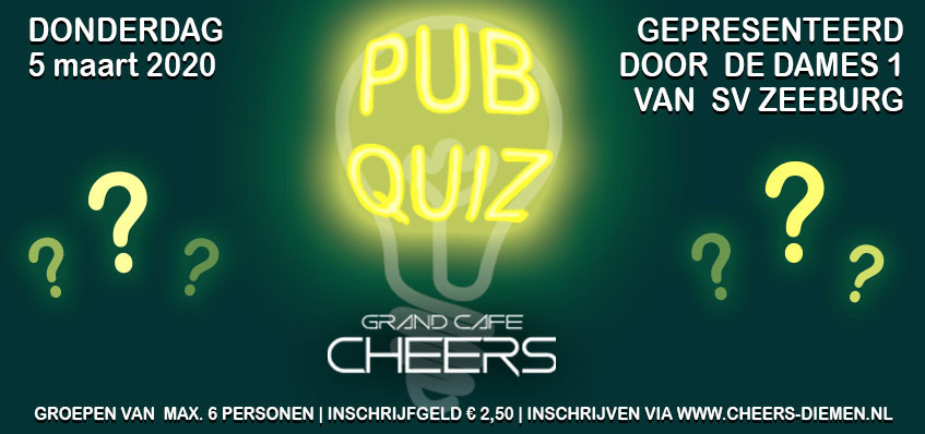 Ook deze 1e quiz van het jaar wordt weer gepresenteerd door de dames van het SV Zeeburg handbalteam. Dit belooft weer een supergezellige avond te worden met uiteraard weer de wisselbeker en leuke prijzen! Waaronder de gratis bon voor het hele team! Dus schrijf je in (max 6 personen per team), kom eventueel gezellig eten vooraf, win de quiz, en de hele bon van de hele avond voor jouw team wordt zo de prullenbak in gegooid!