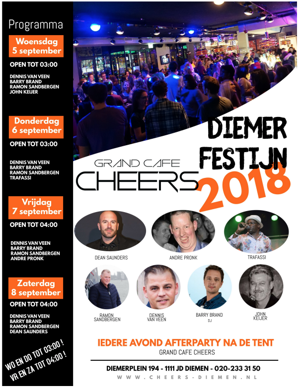 Het is weer zo ver! De afterparty van het Diemerfestijn iedere dag direct na de tent! Dit jaar weer geweldige artiesten en woensdag en donderdag open tot 03:00 en vrijdag en zaterdag open tot 04:00! Woensdag 5 september: Ramon Sandbergen Dennis van Veen DJ Barry Brand John Keijer Donderdag 6 september: Ramon Sandbergen Dennis van