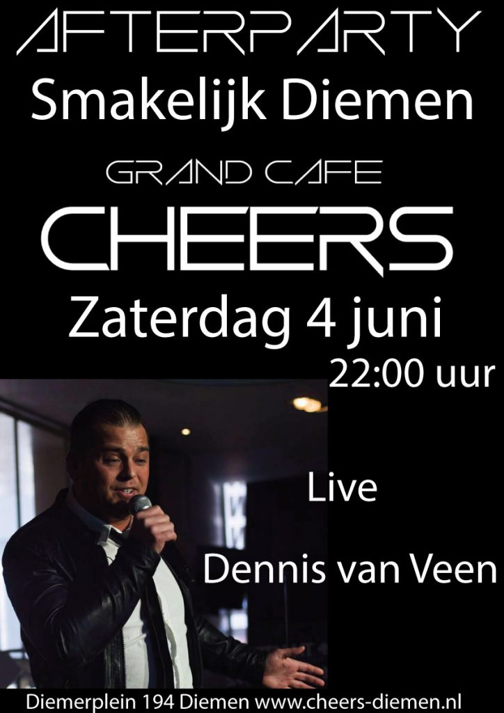Zaterdag 4 juni is op het Diemerplein het evenement “Smakelijk Diemen” met vele proeverijen van diverse restaurants uit Diemen. Uiteraard zijn wij ook van de partij en treden er diverse artiesten op met o.a. Dries Roelvink, Patrick van Veen, Quincy, Danilo en Dennis Alberti. Deze optredens duren tot 22:00, maar bij Cheers gaat het nog