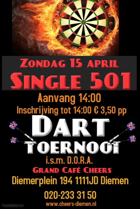In samenwerking met Dartorganisatie Regio Amsterdam organiseren wij op zondag 15 april een Single 501 darttoernooi. Inschrijven kan tot 14:00 en bedraagt € 3,50 pp .