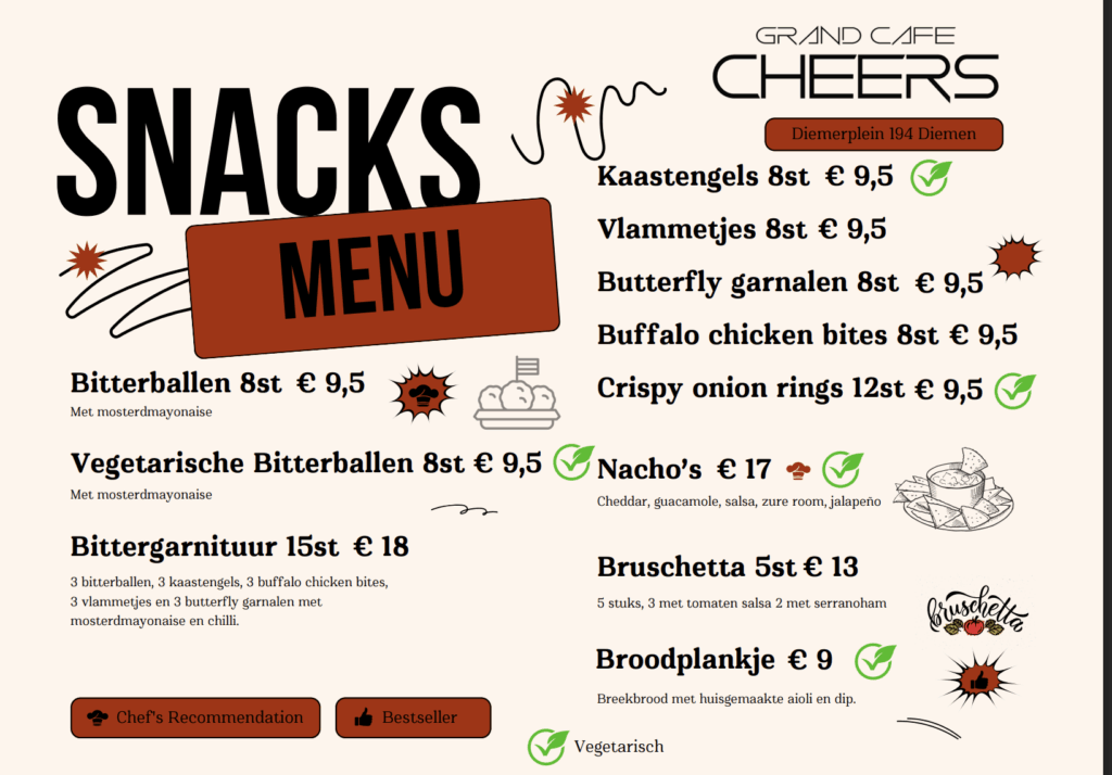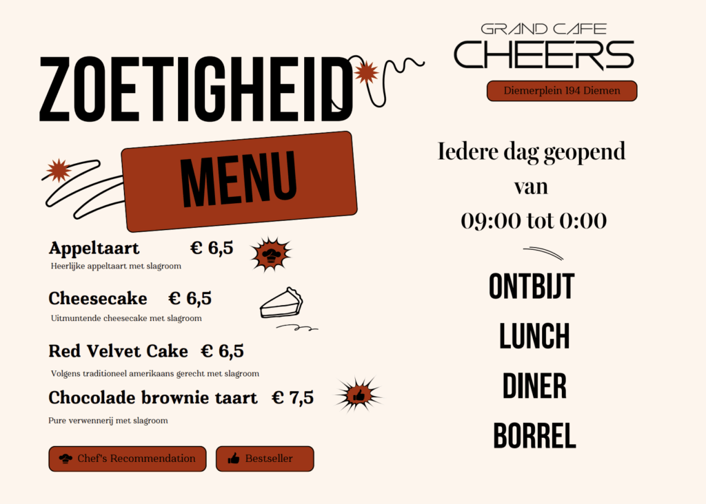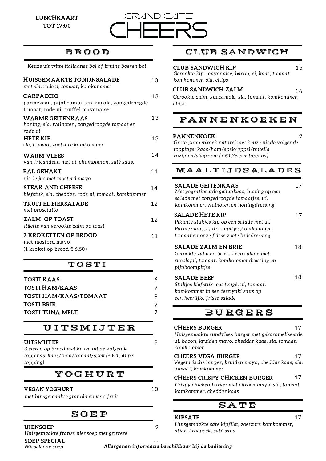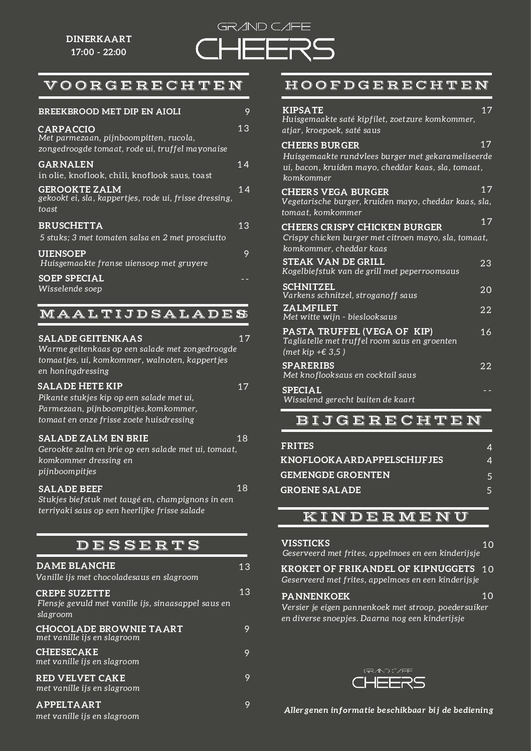 Menu Hieronder vindt u onze menukaarten. Buiten deze kaarten zijn er vaak nieuwe gerechten of verrassende aanbiedingen die ons personeel u graag vertellen tijdens uw bezoek. Lunch Diner Drinks Downloaden Snacks Zoetigheid