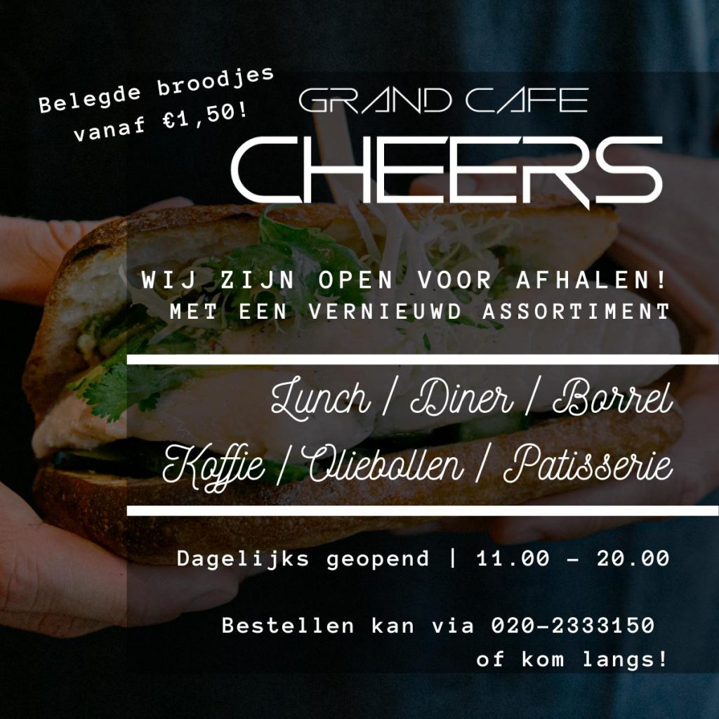 We zijn vanaf zaterdag 17 oktober weer open voor afhalen. Deze keer super uitgebreid en met veel extra lekkere dingen! Buiten onze reguliere heerlijke gerechten hebben we nu ook meer broodjes voor de lunch, koffie to go, en hebben we een gehele patisserie opgezet met heerlijke bonbons, truffels etcetera. Tevens gaan we de feestdagen toch wat vrolijker proberen te maken door oliebollen en nog meer verrassingen te maken. Kortom; More@cheers! En hou ons in de gaten voor nog meer verrassende dingen de komende tijd!