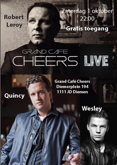 Robert Leroy, Quincy en Wesley gaan deze avond schitteren in de prachtige ambiance van Cheers! Dit belooft een geweldige avond te worden met veel live muziek en gezelligheid.